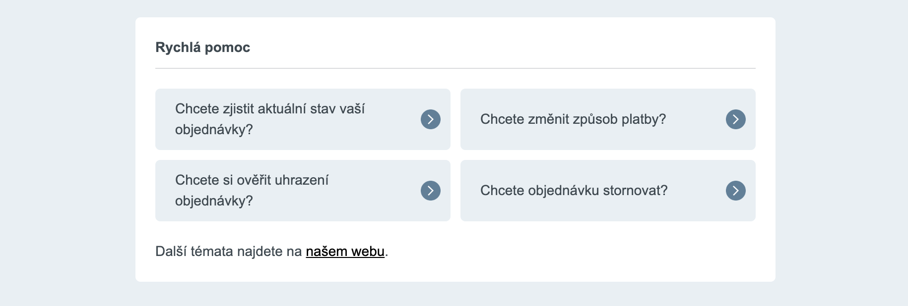 Samoobsluhu jsme vložili hned na několik míst na webu a také ji propojili s klientským účtem. Navíc v ní chytře v ní pracujeme s daty, které o zákaznících a objednávkách máme. Díky tomu jsme dokázali jednotlivé situace šikovně napodmínkovat.