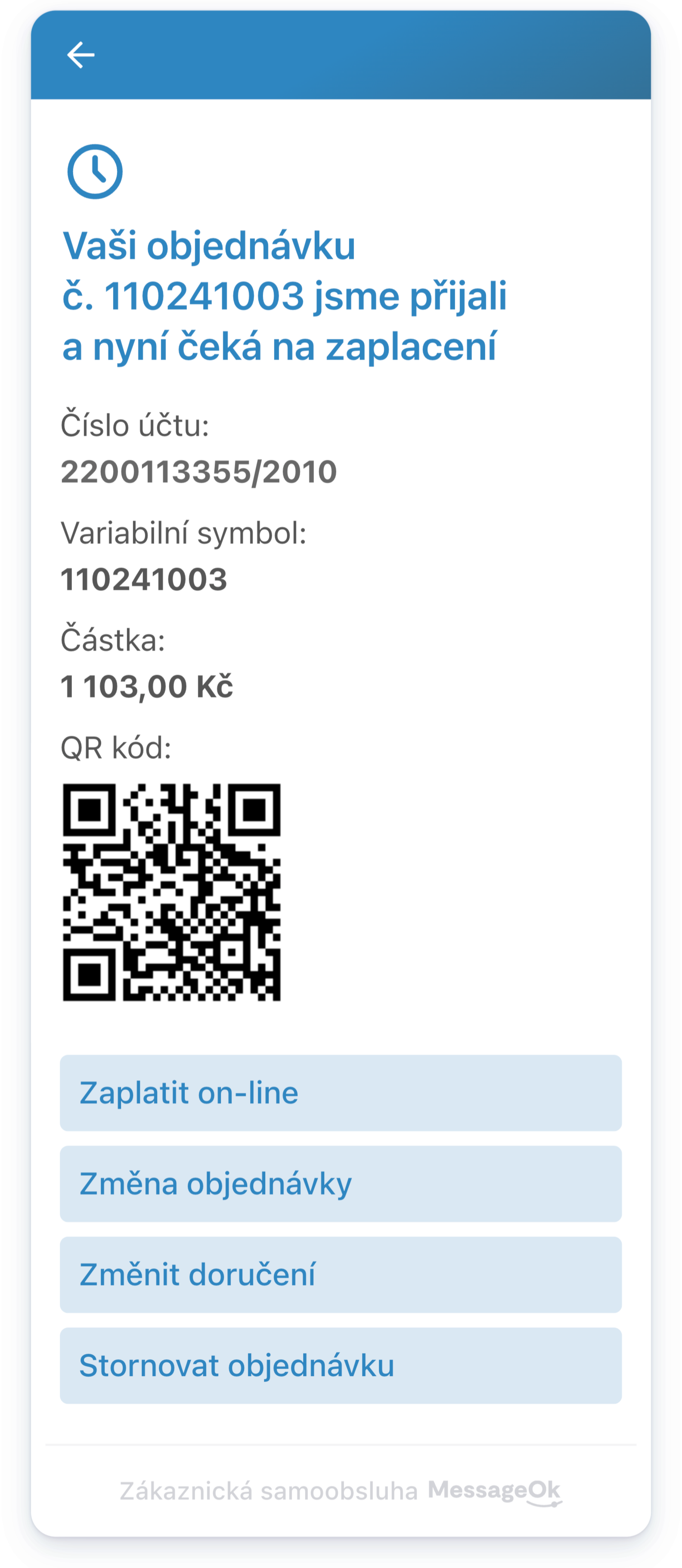 Díky aktuálním informacím, které načítáme, můžeme zákazníka nasměrovat znovu na platební bránu nebo vygenerovat QR kód k platbě pokud víme, že jeho objednávka není ještě uhrazena.